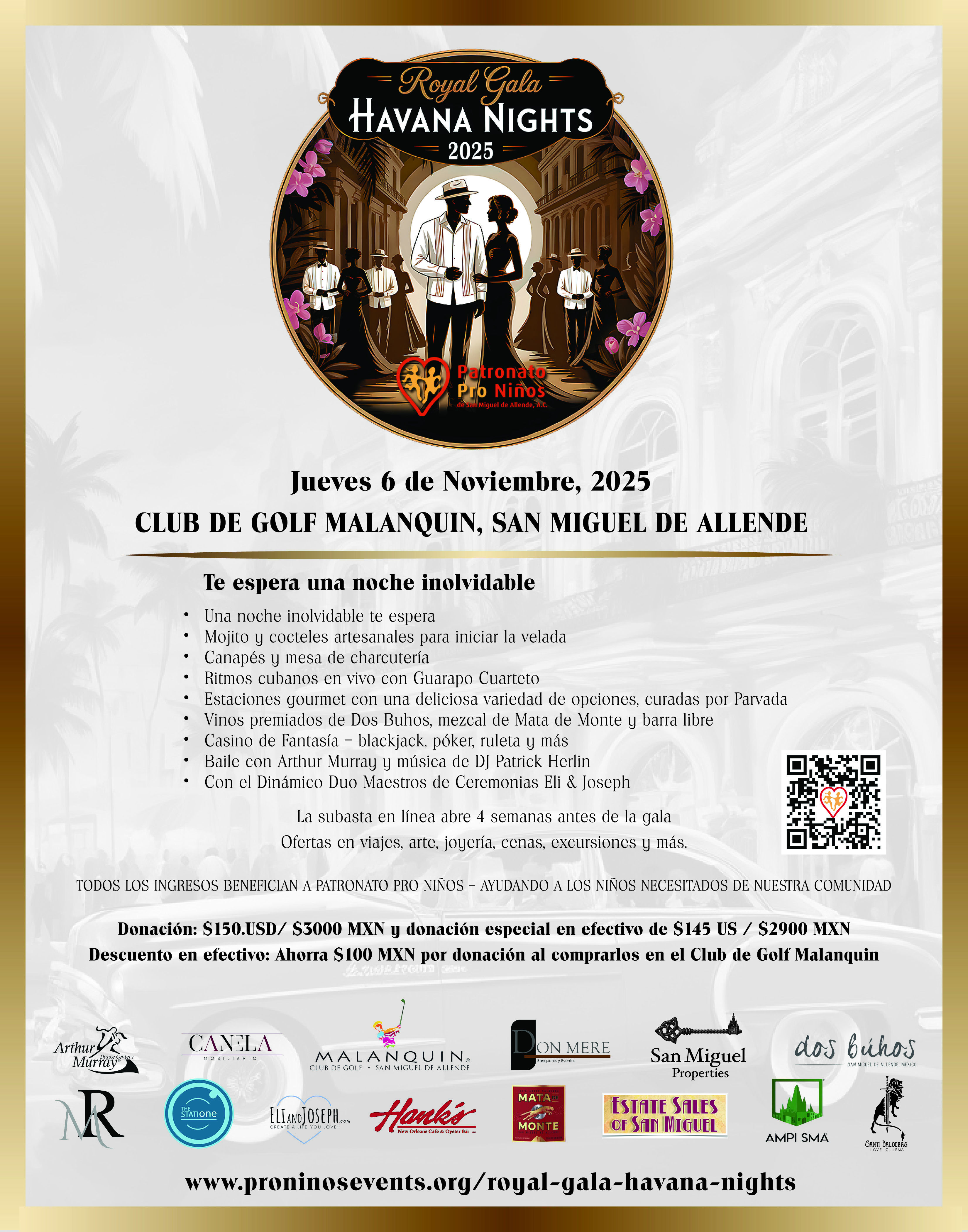 Español abajo The doors are open — and spots are limited! We are thrilled to announce that ticket donations are now being accepted to reserve your place at this year's Royal Gala - Havana Nights! Last year's Gala reached capacity quickly, and we expect the same excitement this year. Don’t miss your chance to experience an unforgettable evening of music, dancing, dining, fantasy casino, and celebration — all in support of Patronato Pro Niños, providing life-changing medical, dental, social, and psychological care to thousands of children and families in San Miguel de Allende. Make your donation today to ensure you don’t miss this extraordinary night:proninosevents.org/royal-gala-havana-nights
