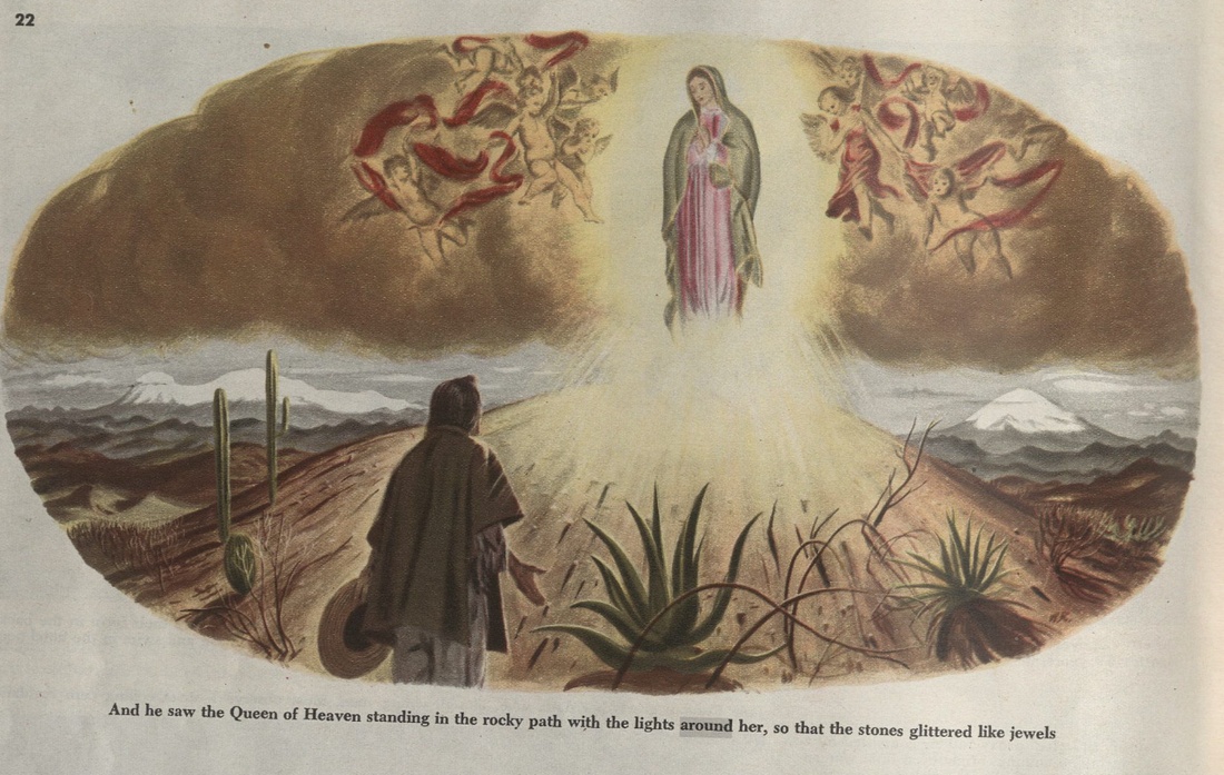 In the December 25, 1948 edition of Collier's magazine, the American writer John Steinbeck published his version of the story, entitling it "The Miracle of Tepayac." In the plainspoken style that characterized Steinbeck's two Mexican novels—The Pearl and Tortilla Flat—he began the magazine piece with Juan Diego's sorrow at the death of his wife, a bereavement that sent him "wandering over the hills, spending his strength the way a grieving man does."