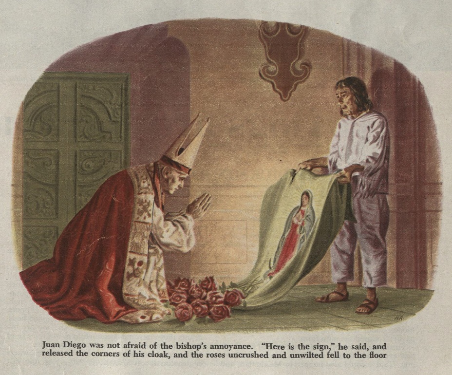 The bishop is annoyed, but Juan Diego, now unafraid, declares "Here is the sign." As he releases the corners of his cloak, the roses, "uncrushed and unwilted," fall to the floor. The bishop falls to his knees. And then another miracle: on the rough cactus fiber of Juan Diego's cloak they find the image of the Mother of God.