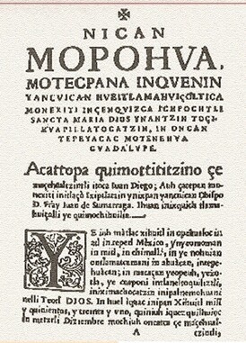 It's not clear whether Steinbeck consulted the Nican Mopohua when he set about to write the Guadalupe story for Collier's. The first printed version, in Nahuatl, appeared in Mexico in 1649. A Spanish translation did not appear until 1929. English translations existed by the time of Steinbeck's Collier's piece, but whether he was aware of them is not known.