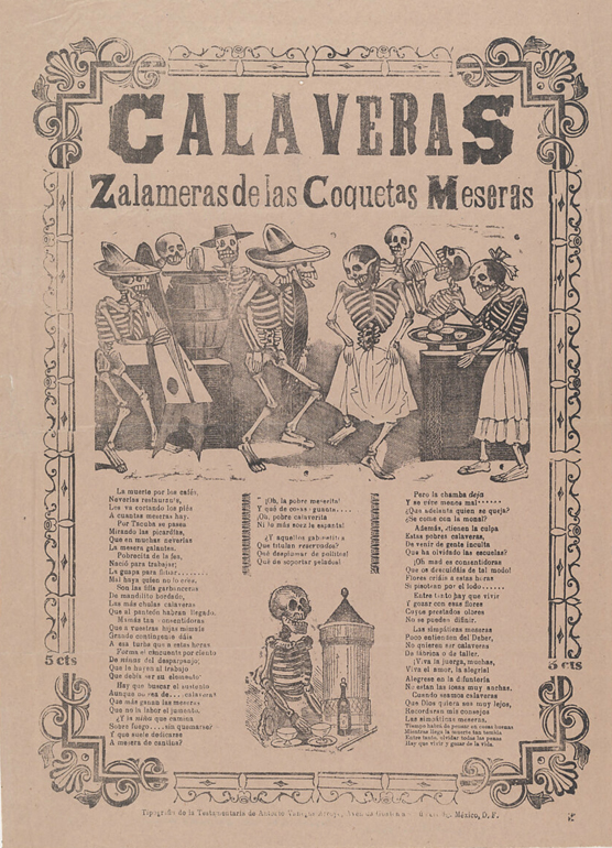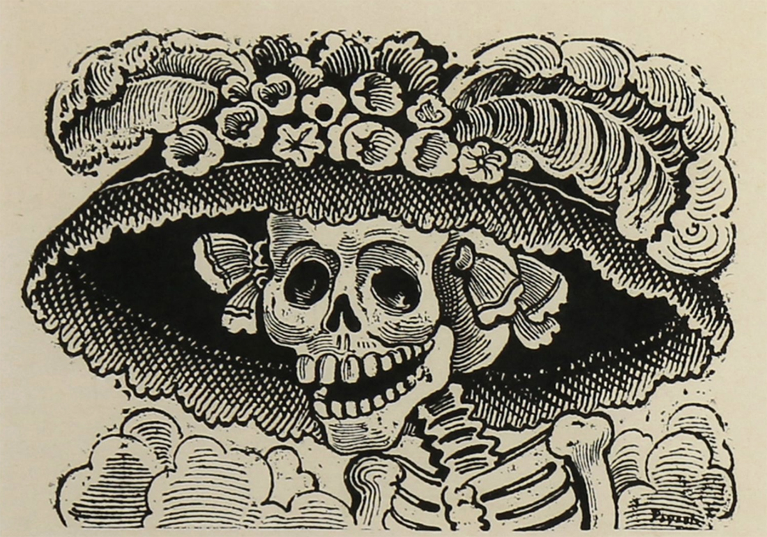 La esqueleto femenina, lujosamente vestida, sigue siendo tanto una aguda sátira cultural como una imagen simbólica de gran respeto en relación con el Día de Muertos en México. Riéndose frente a la muerte, representa la unión del ciclo vital que conecta la vida y la muerte. Puede que no sea una figura ancestral, pero sabe girar una enorme falda típica de Jalisco, sabe bailar, y México baila con ella.