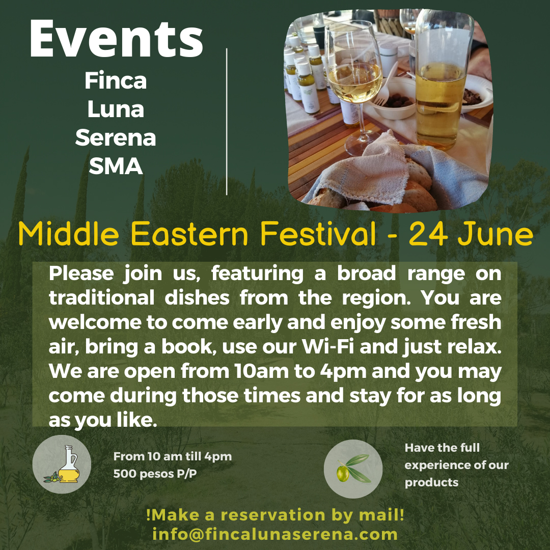 Please join us for a Middle Eastern Festival, featuring a broad range on traditional dishes from the region. It will be held on from June 24th. You are welcome to come early and enjoy some fresh air, bring a book, use our Wi-Fi and just relax. We are open from 10am to 4pm and you may come during those times and stay for as long as you like. Lunch will be served from 12 pm to 1:30 pm at your discretion. Transportation provided from and to Liverpool Make your reservation by mail - info@fincalunaserena.com
