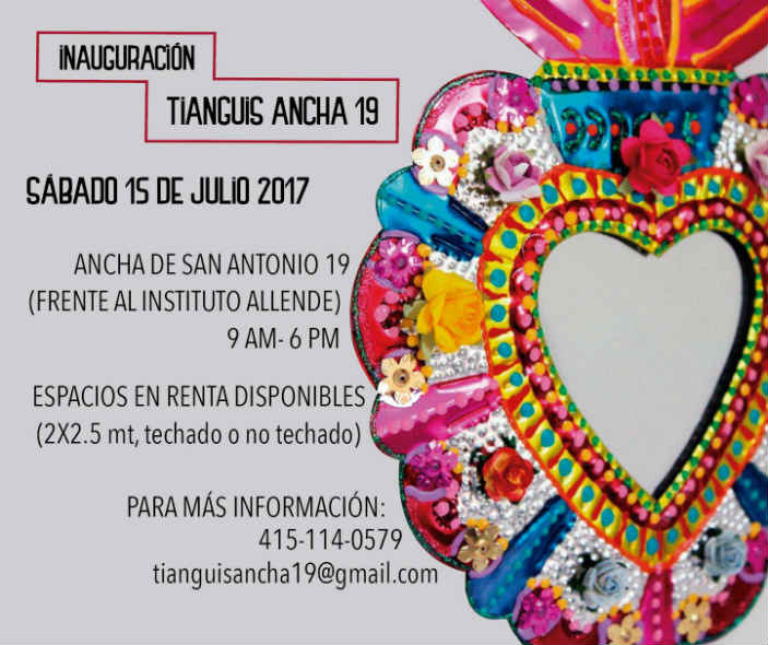 Tianguis Ancha 19 and its collaborators, invite you to its Opening this Saturday, July 15th. Enjoy a central and environmental brand new brand, we have a wide variety of handmade products, jewelry, clothing, shoes, appliances, trim, etc.