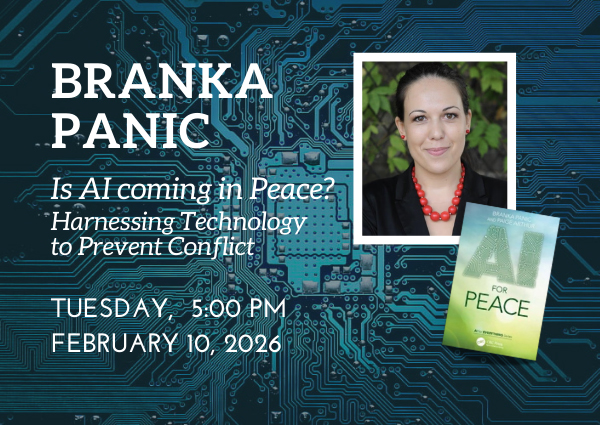 We are pleased to welcome Branka Panic for her talk Is AI Coming in Peace? Harnessing Technology to Prevent Conflict on Tuesday, February 10, 2026 at 5:00 pm at La Casona Event Center. Drawing on real-world examples and emerging research, Branka will explore how AI is already shaping global security, diplomacy, and social stability—and how thoughtful design and governance could help steer these tools toward reducing violence rather than fueling it.