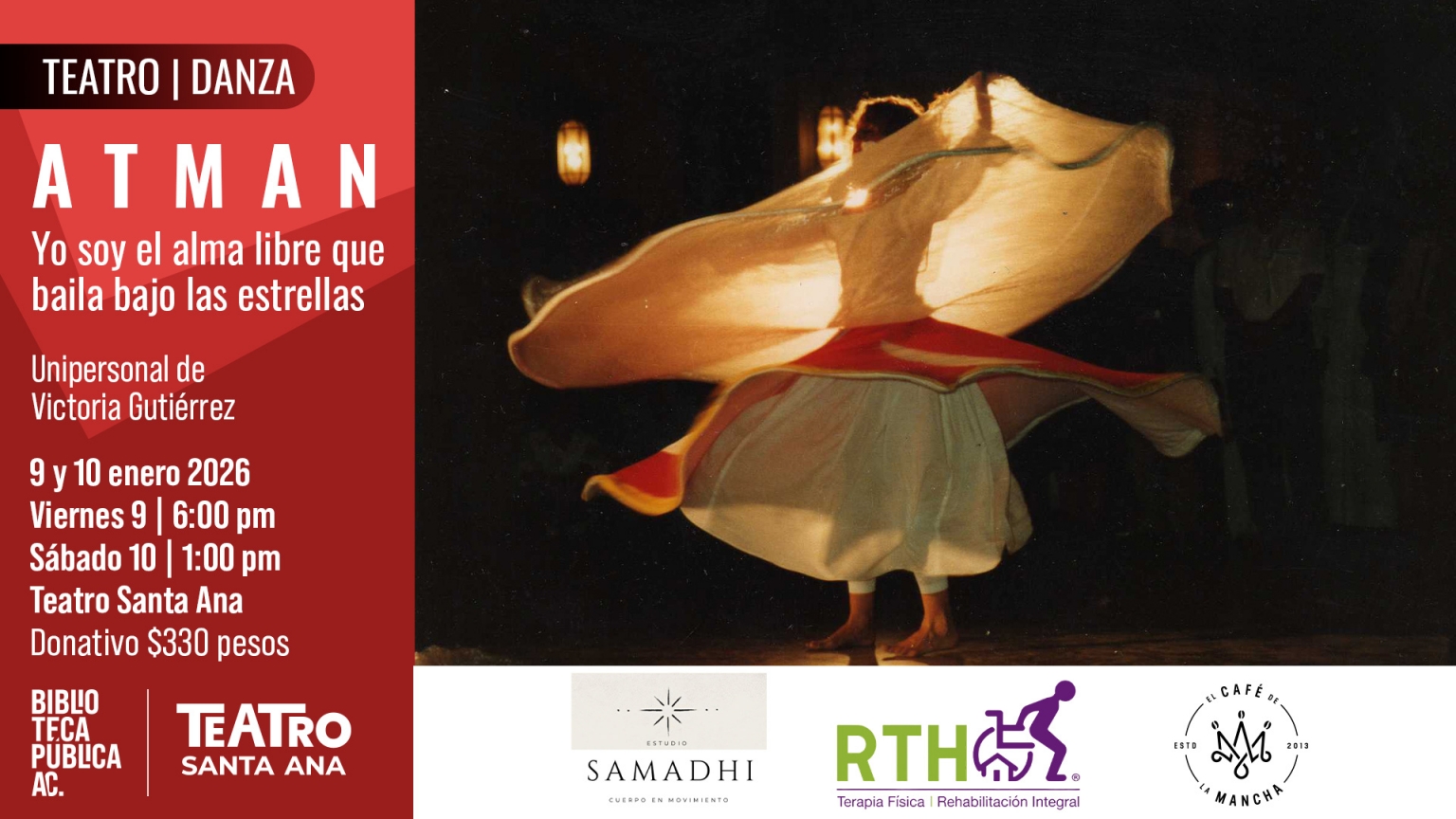 “ATMAN represents the union of my experience in dance, theater, and Eastern philosophy — the essence of thirty years of my artistic journey. Gesture, the language of the body, movement, and rhythm form the foundation of my personal language — rigorous and expressive — always in search of the sacred within artistic creation, and as a path toward human growth. ATMAN is a meditative theatrical event that invites the audience to recognize themselves in ATMAN — the essence, the ‘I AM’.” —Victoria Gutierrez *** Atman, Danza Sufi Dance Enero 9, 10; viernes 6pm, sábado 1pm Teatro Santa Ana $330 https://labibliotecapublica.org/taquillaeventos/ ATMAN, yo soy el alma libre que baila bajo las estrellas — unipersonal de Victoria Gutiérrez.