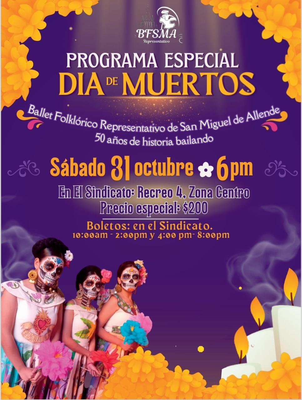 El Ballet Folklórico Representativo de San Miguel de Allende te invita a su Programa Especial de Día de Muertos, una noche llena de color, danza y raíces mexicanas. Ven a vivir 50 años de historia bailando y a rendir homenaje a nuestras tradiciones con un espectáculo inolvidable.