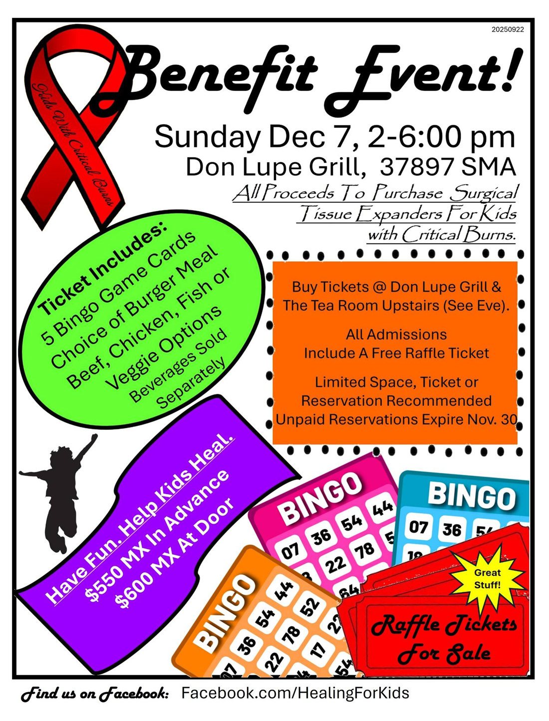 Les extendemos esta invitación en nombre de Healing For Kids SMA, un grupo de amigos que recauda fondos para niños con quemaduras graves. Se requieren boletos. ¡Coman! ¡Jueguen al bingo! ¡Participen en rifas! ¡Diviértanse! Ayuden a sanar a los niños recaudando fondos para expansores de tejido para cirugía plástica para niños mexicanos con quemaduras graves. El Dr. Bosco es un cirujano plástico reconocido mundialmente, ubicado aquí mismo en San Miguel de Allende (La Clínica). Pueden encontrar más información sobre él y su misión en nuestra página de Facebook: HealingForKidsSMA.