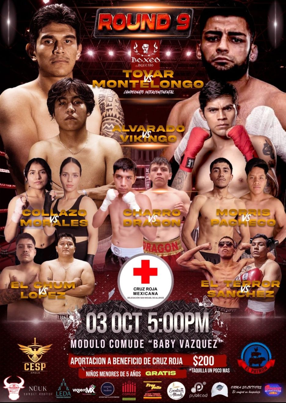 Boxing benefit for Cruz Roja. Main card at 5pm at Módulo Baby Vázquez (Comude). Children under 5 free; proceeds support Cruz Roja.