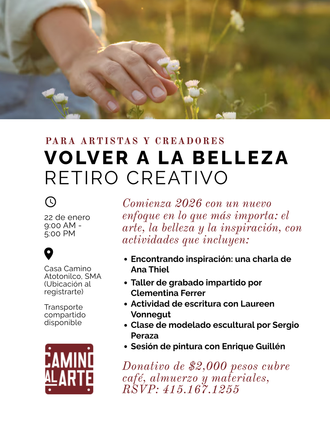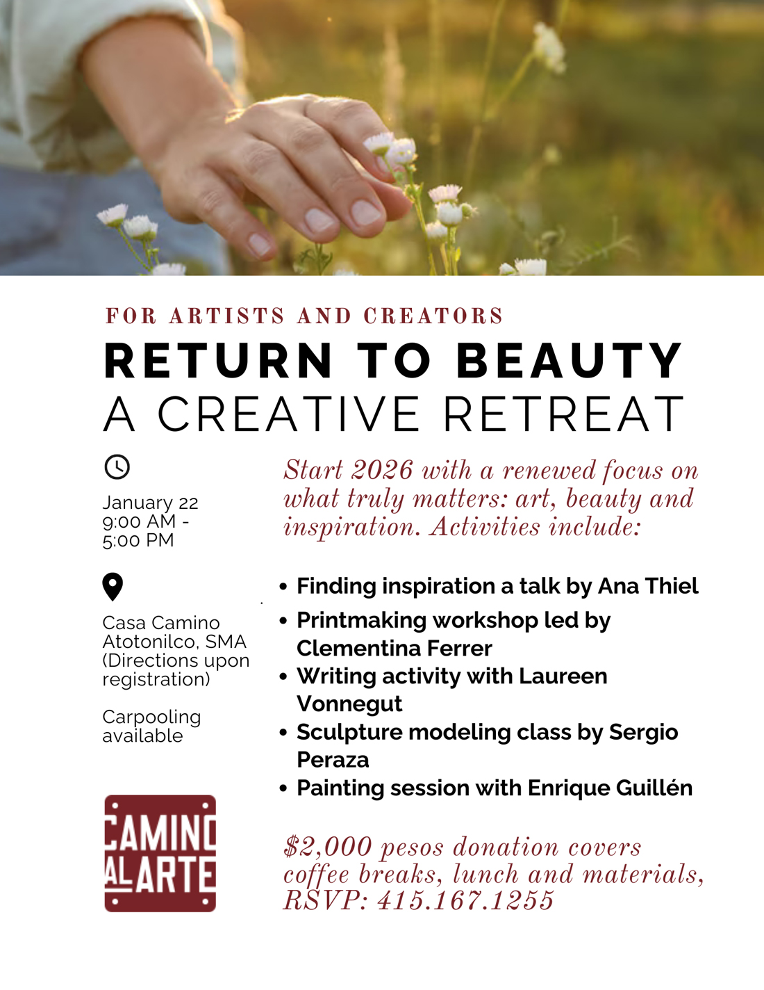 Workshops (to choose from): Printmaking (Clementina Ferrer), Writing from the Senses (Laureen Vonnegut), Expressive Painting (Enrique Guillén), Sculpture Modeling (Sergio Peraza).