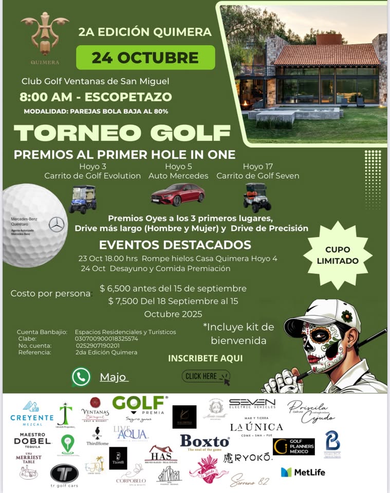 2a Edición Quimera - Torneo de Golf. Modalidad: Parejas Bola Baja al 80%. Premios al primer Hole in One: Hoyo 3 Carrito de Golf Evolution, Hoyo 5 Auto Mercedes, Hoyo 17 Carrito de Golf Seven. También premios a los tres primeros lugares, drive más largo (hombre y mujer) y drive de precisión.