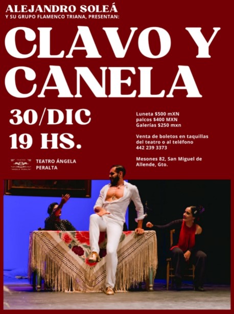 Alejandro Soleá y su grupo Flamenco Triana presentan el espectáculo *Clavo y Canela*. El evento se realizará el 30 de diciembre de 2025 a las 19:00 horas en el Teatro Ángela Peralta, Mesones 82. Se requieren boletos. Luneta $500, Palcos $400, Galerías $250. Los boletos pueden adquirirse en taquilla o al teléfono 442 239 3373.