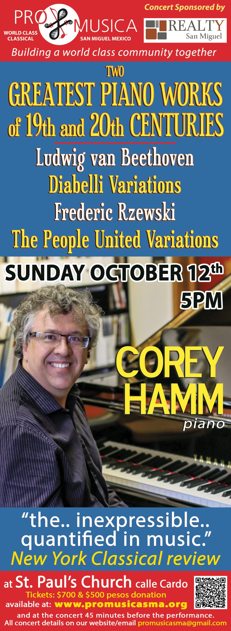El pianista canadiense Corey Hamm se presentará en concierto en la Iglesia de St. Paul el domingo 12 de octubre a las 5pm, en un emocionante recital en solitario que presenta dos obras maestras de la literatura pianística del siglo XX. El programa comienza con la Sonata para piano n.º 8 en si bemol mayor, Op. 84 de Sergei Prokofiev, compuesta en 1944. Tras un breve intermedio, Hamm interpretará la monumental obra de Frederic Rzewski ¡El pueblo unido jamás será vencido! de 1975, una obra que consiste en 36 variaciones sobre la canción de protesta chilena “¡El pueblo unido jamás será vencido!” Haga clic en el botón de abajo para ver tocar a Corey Hamm: