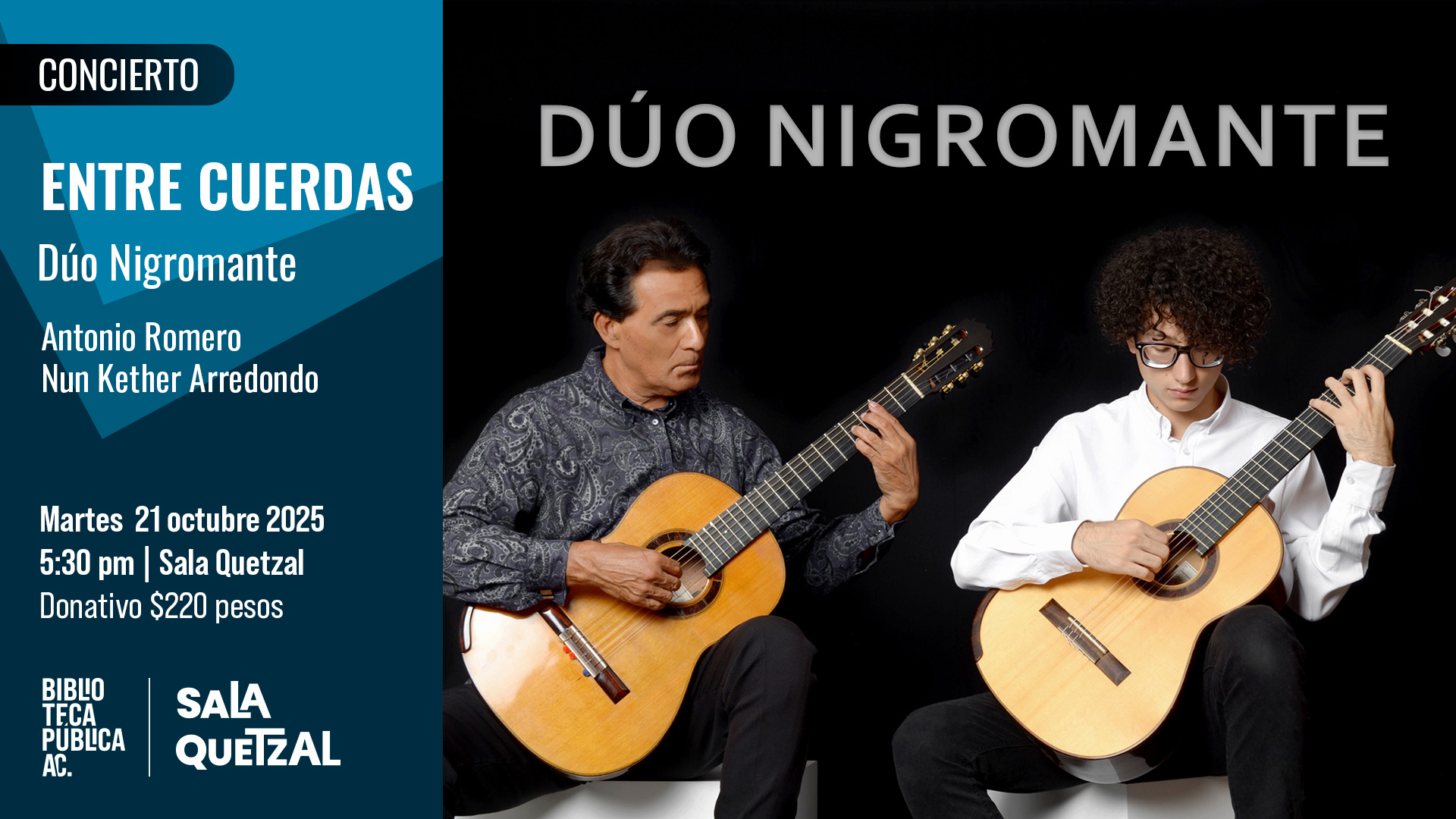 Dúo Nigromante presenta un programa de guitarra clásica conformado por piezas que van desde la música barroca hasta la música contemporánea. Se interpretarán piezas a dúo de Antonio Vivaldi, Enrique Granados, Astor Piazzolla y Julio César Oliva, así como piezas solistas de compositores variados. Formado en enero de 2022 y conformado por Antonio Romero García y Nun Kether Arredondo Granados, guitarristas originarios de San Miguel de Allende, el conjunto se caracteriza por sus presentaciones eclécticas que combinan el orden y elegancia del repertorio clásico con la expresividad y naturaleza impredecible de la música clásica contemporánea. El resultado crea un interesante contraste de eras, autores e idiomas musicales que representa el amplio espectro de posibilidades que ofrece la guitarra como medio de expresión artística. Tu entrada es un donativo para La Biblioteca. Adquiérela aquí: labibliotecapublica.org/taquillaeventos/