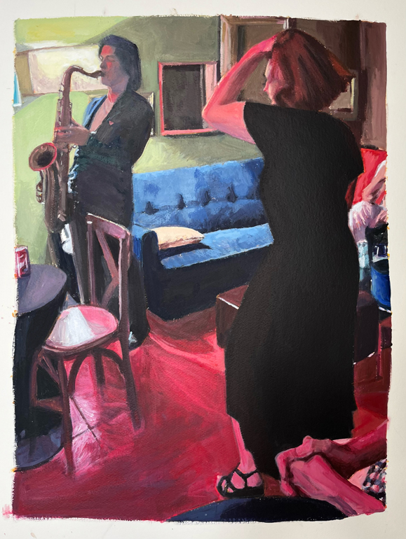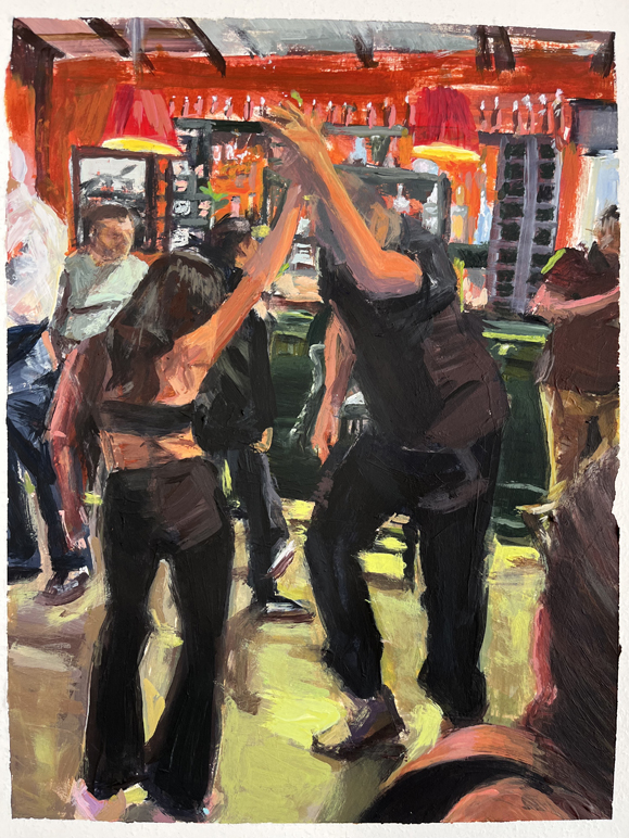 A un nivel más técnico, grabo un vídeo y hago capturas de pantalla y luego elijo el mejor para pintar. Elegir entre dos fotogramas de vídeo, grabados con sólo una fracción de segundo de diferencia, es un proceso reflexivo e intuitivo. Cuando era profesor de arte en una escuela secundaria del sistema de escuelas públicas de Chicago, tenía que aprovechar al máximo nuestro limitado presupuesto para suministros de arte: les enseñé a los estudiantes que podían crear miles de colores simplemente mezclando rojo, amarillo, azul y blanco básicos, y hasta el día de hoy sigo practicando lo que prediqué. Para mí, crea una apariencia más auténtica que un juego de pintura con docenas de bonitos colores. Las sombras y la luz son siempre una parte principal de mi enfoque, y también me esfuerzo por transmitir detalles (en lugar de recrearlos) con pinceladas impresionistas. Si tengo un objetivo con una pintura específica, es combinar estos materiales y técnicas con el movimiento figurativo y pictórico, para crear una sensación de alegría y alegría.