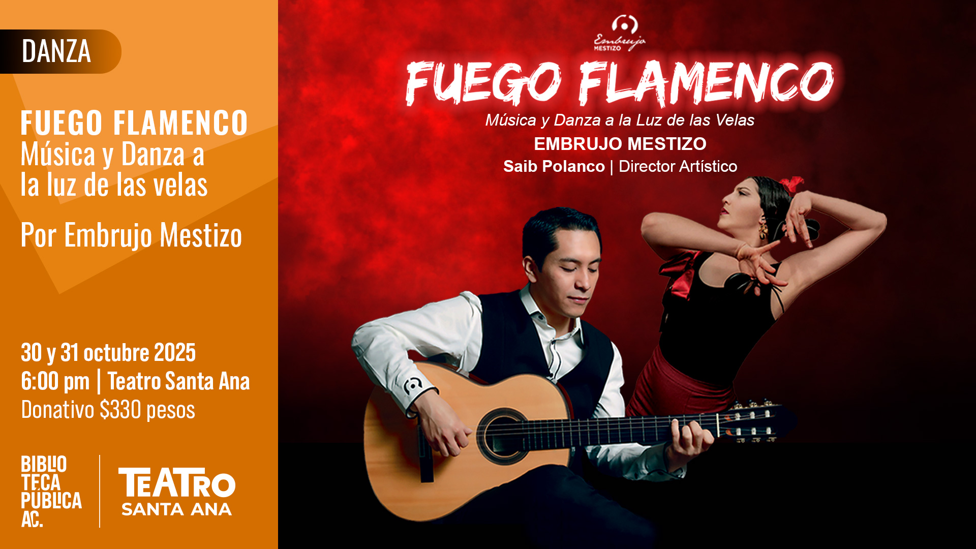 Embrujo Mestizo trae para ti un espectacular show de música y danza flamenca a la luz de las velas. Con composiciones y arreglos musicales con tintes contemporáneos, Saib Polanco y Laura Marroquín se expresan a través de la fuerza de la guitarra y el sonido distintivo de las castañuelas. La danza, intensa y precisa, traza el espacio con cada movimiento, llenándolo de energía y emoción contenida.