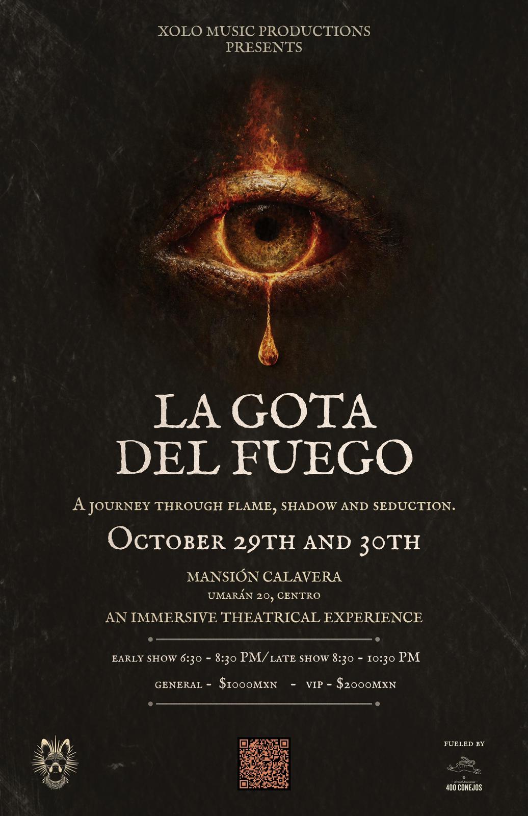 Me emociona invitarte a mi proyecto más atrevido: La Gota del Fuego, un cabaret teatral inmersivo que llega a la Mansión Calavera el 29 y 30 de octubre.