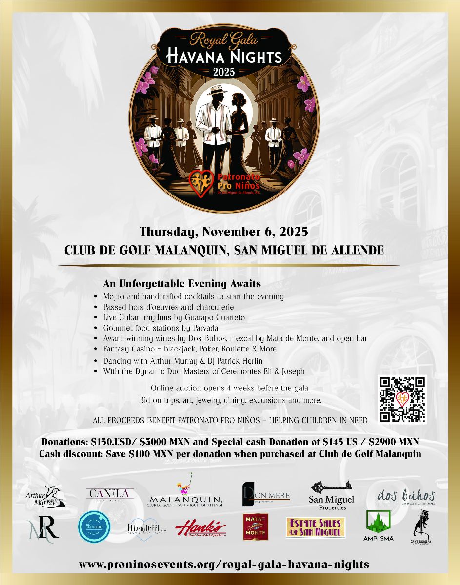 Español abajo The doors are open — and spots are limited! We are thrilled to announce that ticket donations are now being accepted to reserve your place at this year's Royal Gala - Havana Nights! Last year's Gala reached capacity quickly, and we expect the same excitement this year. Don’t miss your chance to experience an unforgettable evening of music, dancing, dining, fantasy casino, and celebration — all in support of Patronato Pro Niños, providing life-changing medical, dental, social, and psychological care to thousands of children and families in San Miguel de Allende. Make your donation today to ensure you don’t miss this extraordinary night:proninosevents.org/royal-gala-havana-nights