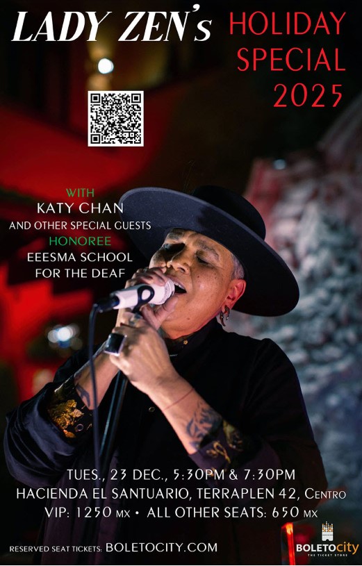 Never fear. Lady Zen’s Holiday Special 2025 is scheduled for two shows on Tuesday, December 23, at Hacienda El Santuario, a luxury boutique hotel in Centro, at Terraplen 42. Zen will be performing with a band, and with special guests—among them, Chilean-born singer Katy Chan, a dynamic artist who has been a member of more than twenty musical groups in Chile and Argentina; and virtuoso guitarist and recording artist Román Sebastián. The concert’s honoree, EEESMA School for the Deaf, will have on hand its remarkable sign-language children’s choir.