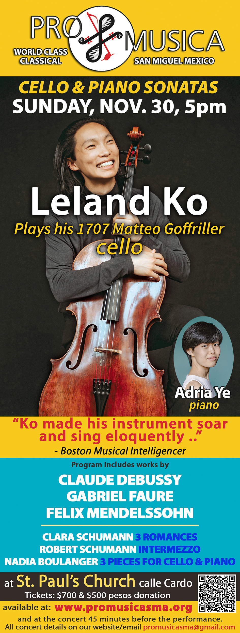 Tickets are $300, $500, and $700 pesos donation, available online and at the venue 45 minutes before the performance. Full details about Pro Musica’s concerts and Patron Membership are at promusicasma.org or via promusicasma@gmail.com.