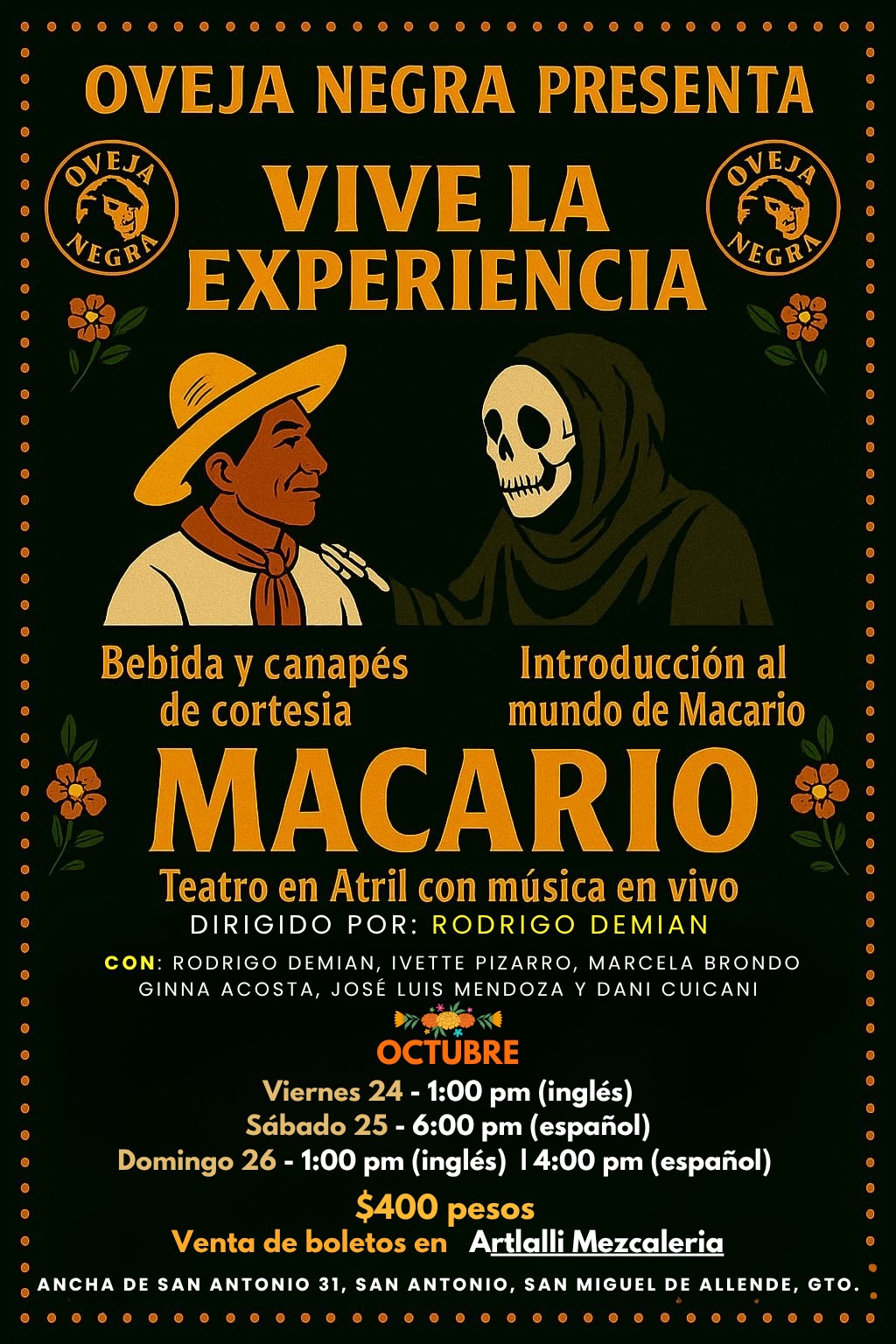 Macario es presentado por la compañía de teatro Oveja Negra como una lectura teatral con música en vivo, en cuatro funciones, dos en inglés y dos en español, los días 24, 25 y 26 de octubre, viernes, sábado y domingo. El espacio de actuación es Artlalli, Ancha de San Antonio 31 en el centro de San Miguel, una popular mezcalería que, además de mezcal, ofrece cervezas y cócteles, además de comida oaxaqueña.