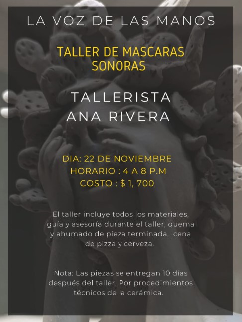 Tallerista: Ana Rivera ("Cerámica con alma"). El taller incluye todos los materiales, guía y asesoría durante la sesión, quema y ahumado de la pieza terminada, y una cena de pizza y cerveza. Las piezas terminadas se entregan 10 días después del taller.