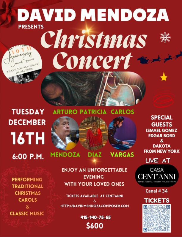 For this concert he will share a very special Christmas Concert, playing Christmas Carols and Classic Music by wonderful composers like J. Sebastian Bach, Jules Massenet, Gustav Mahler and more… Mendoza will perform this marvelous music beside the talented Carlos Vargas on the piano from Mexico City, David’s amazing parents Ignacio Arturo Mendoza Islas on Baritone Voice, Patricia Diaz Becerra on soprano Voice from Mexico City, as well as the special guests Ismael Gomez on Drums, Edgar Bord on bass and from New York the Soprano "Dakota". This will take place on the gorgeous restaurant and music House CENT'ANNI on Canal #34, in an intimate and very high level concert in San Miguel de Allende, the heart of México.