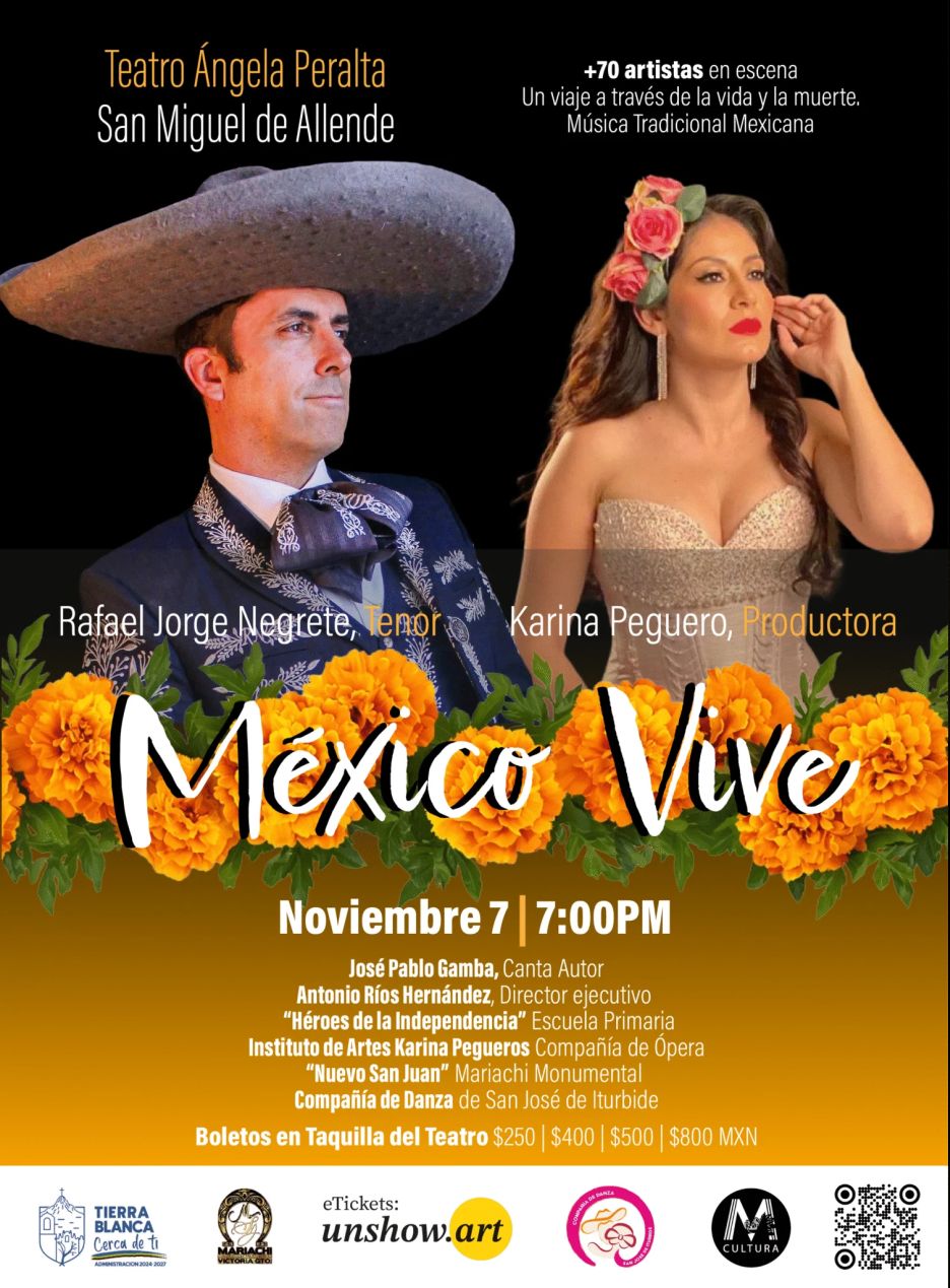 México Vive es un espectáculo musical que celebra la riqueza cultural de nuestro país a través de un viaje por la vida y la muerte, con más de 70 artistas en escena. La puesta en escena fusiona música tradicional mexicana, ópera, mariachi y danza folklórica en una emotiva experiencia visual y sonora. Se llevará a cabo en el Teatro Ángela Peralta, el 7 de noviembre a las 7:00 PM. El evento contará con la participación del tenor Rafael Jorge Negrete, la soprano Karina Peguero y el canta autor José Pablo Gamba, junto a la Compañía de Ópera del Instituto de Artes Karina Peguero, el Mariachi Monumental “San Juan” y la Compañía de Danza de San José Iturbide. Rafael Jorge Negrete — TenorDescendiente de una gran tradición artística, Rafael Jorge Negrete es un tenor mexicano reconocido por su poderosa voz y su interpretación apasionada de la música vernácula. Ha llevado la canción mexicana y la ópera a escenarios nacionales e internacionales, destacando por su elegancia y presencia escénica.