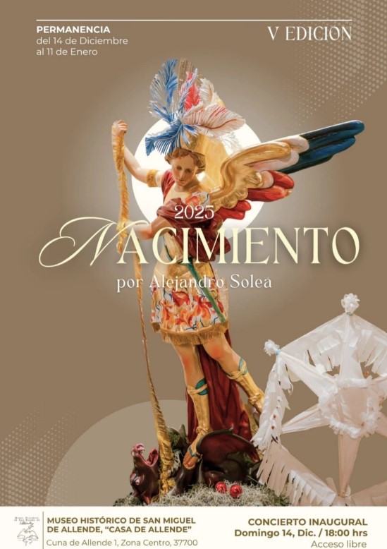 Concierto inaugural del proyecto Nacimiento 2025 por Alejandro Soleá, presentado en el Museo Histórico de San Miguel de Allende, Casa de Allende. El evento se llevará a cabo el domingo 14 de diciembre a las 6pm, con acceso libre. La exposición permanecerá del 14 de diciembre al 11 de enero.