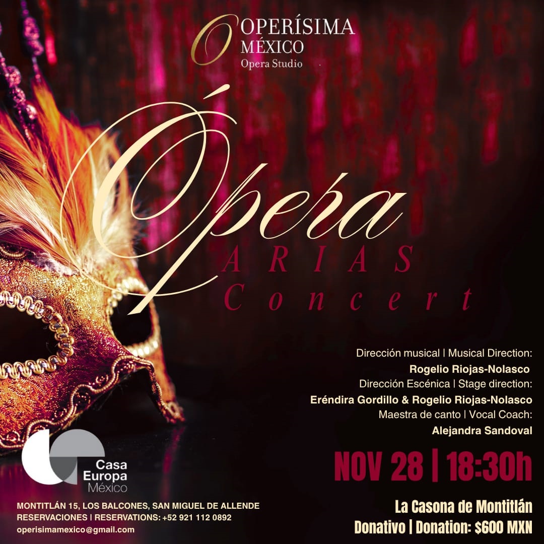 Musical direction by Rogelio Riojas-Nolasco, stage direction by Eréndira Gordillo and Rogelio Riojas-Nolasco, and vocal coaching by Alejandra Sandoval. Enjoy beloved arias from the great operas in the elegant setting of La Casona de Montitlán.