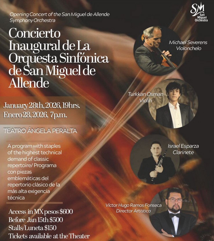 Join us on January 28, 2026, for a celebration of the arts in one of Mexico’s most iconic cities. Formal attire is encouraged, along with a passionate love for the most emblematic pieces of classical music. Tickets available at the box-office or WhatsApp +52 415 566 3644. *** Concierto inaugural de la Orquesta Sinfónica Miércoles, 28 de enero, 7pm Teatro Ángela Peralta, Mesones 82 $600; antes del 15 de enero $500; luneta $150 Acompáñanos el 28 de enero de 2026 para celebrar las artes en una de las ciudades más icónicas de México. Se recomienda vestir de manera formal y traer un amor apasionado por las piezas más emblemáticas de la música clásica. Boletos en taquilla o por WhatsApp +52 415 566 3644.