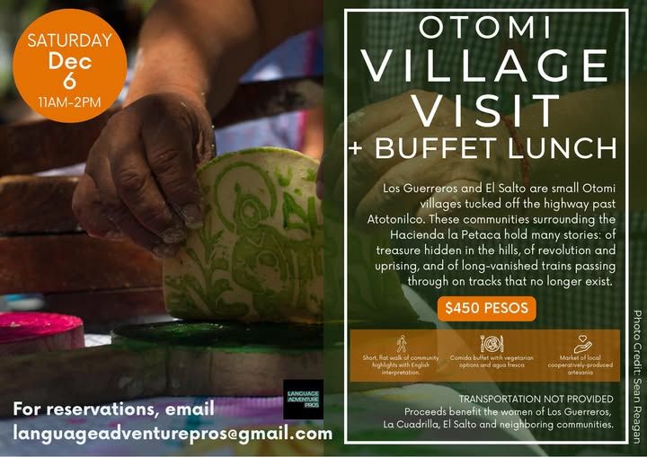 If you are looking for an authentic experience and a homemade, delicious lunch, join us for a visit to rural Otomi villages beyond the touristic Centro. This is a special opportunity to glimpse life in one of the hundreds of communities surrounding our UNESCO World Heritage site. The visit includes entering a chapel normally closed to the public, a short community walk, and a buffet lunch prepared by the señoras. There will also be a small artesania market with handcrafted holiday gifts, including natural body products and embroidery. All proceeds support the women of the community. To reserve your spot, email languageadventurepros@gmail.com with the number of people in your party. Transportation is not provided, but ride sharing will be facilitated.