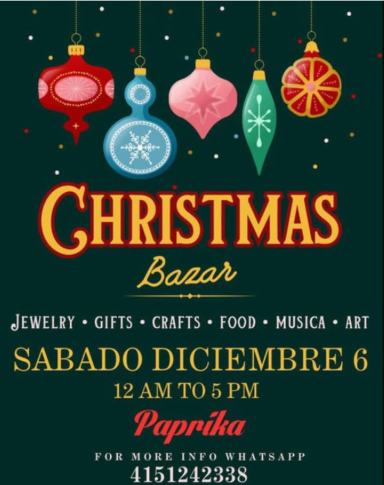 Bazar navideño con joyería, regalos, artesanías, comida, música y arte. Sábado 6 de diciembre de 12pm a 5pm en Paprika Restaurant, Ancha San Antonio 9A. Entrada libre.