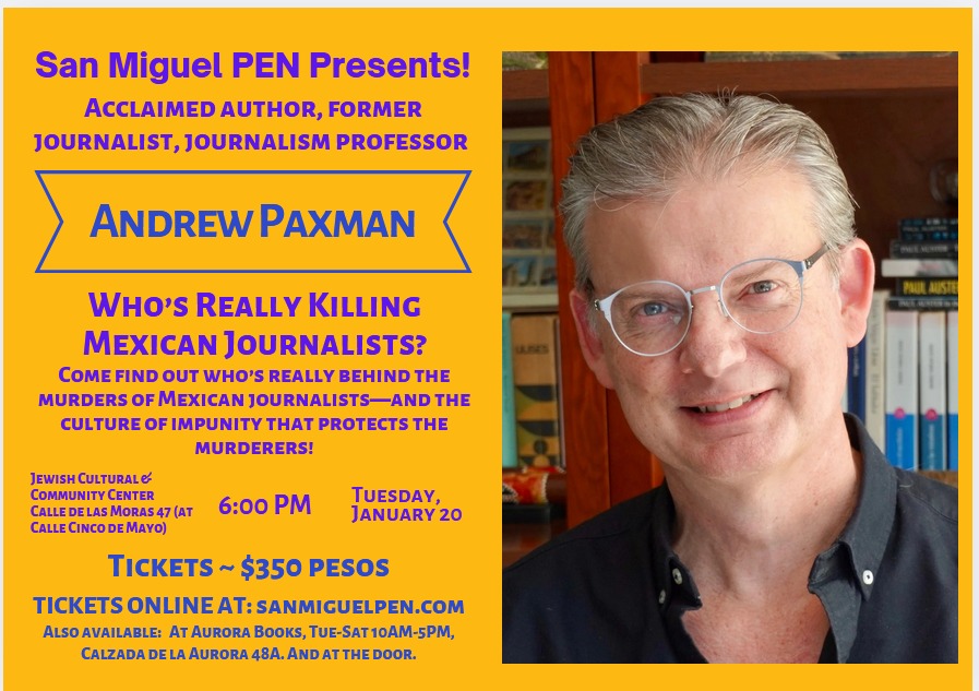 San Miguel PEN is a chapter of PEN International, the organization of writers that defends freedom of expression around the world. Our winter lecture series, San Miguel PEN Presents, raises funds for our ongoing work, including support for journalists under threat of death as well as local literacy projects.