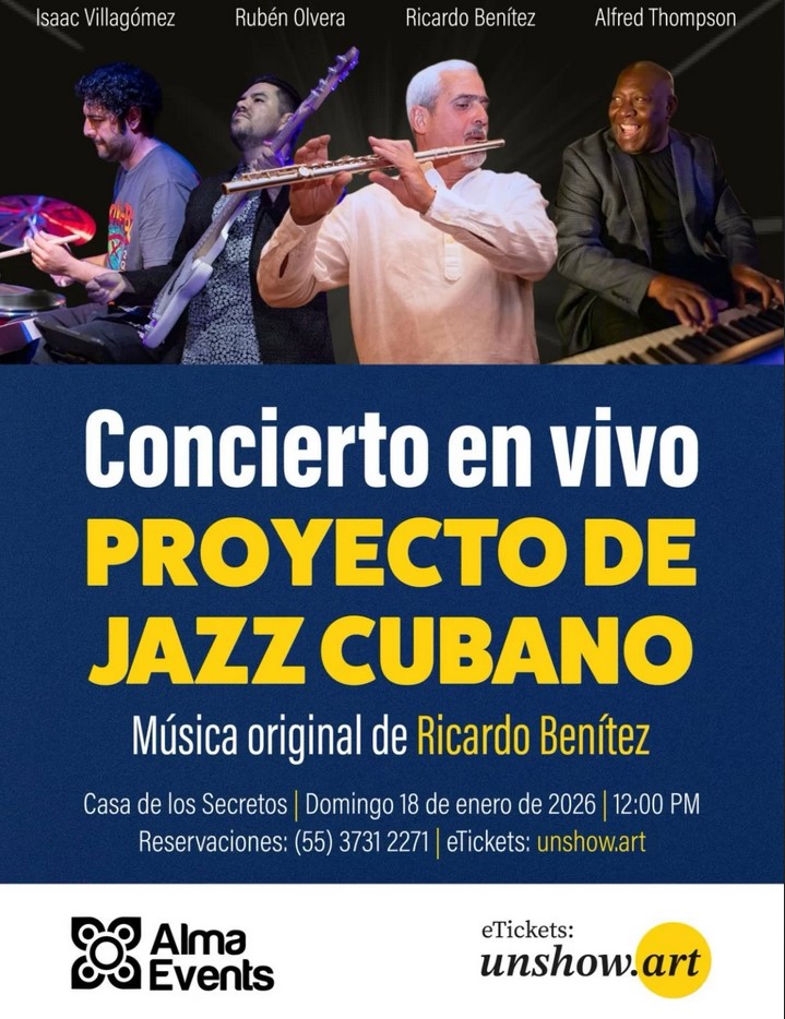 Proyecto de Jazz Cubano es un concierto en vivo que fusiona la rica herencia rítmica de Cuba con la libertad creativa del jazz contemporáneo. Este proyecto reúne a cuatro músicos excepcionales cuyas trayectorias y sensibilidad artística dan forma a un repertorio original, vibrante y profundamente expresivo.