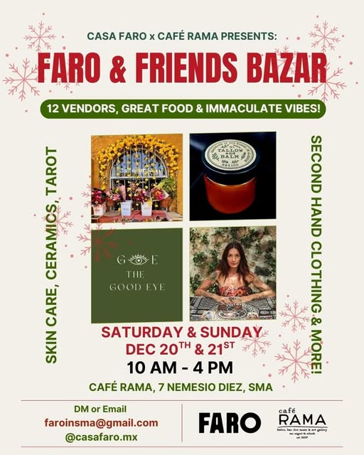 Casa Faro x Café Rama present the Faro & Friends Bazar, featuring 12 vendors, great food & immaculate vibes! Offerings include skin care, ceramics, tarot, second hand clothing & more. The bazaar takes place Saturday & Sunday, Dec 20th & 21st, 10am–4pm at Café Rama, 7 Nemesio Diez, SMA. Contact: faroinsma@gmail.com, @casafaro.mx. *** Faro and Friends Bazaar – bazar Sábado y domingo, 20–21 de diciembre, 10am–4pm Café Rama, Nemesio Diez 7 Gratis Casa Faro x Café Rama presentan el Faro & Friends Bazar, con 12 expositores, excelente comida y vibras inmaculadas. Habrá skin care, cerámica, tarot, ropa de segunda mano y más. Sábado y domingo 20 y 21 de diciembre, 10am–4pm en Café Rama, Nemesio Diez 7, SMA. Contacto: faroinsma@gmail.com, @casafaro.mx.