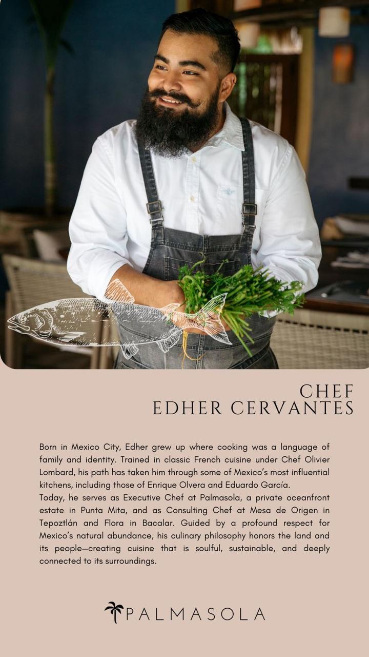 La velada presentará un menú degustación colaborativo creado por el Chef Miguel García de Comité y el Chef Edher Cervantes de Palmasola en Punta Mita. Juntos, elaborarán un menú que celebra los ingredientes regionales y la cocina mexicana contemporánea.
