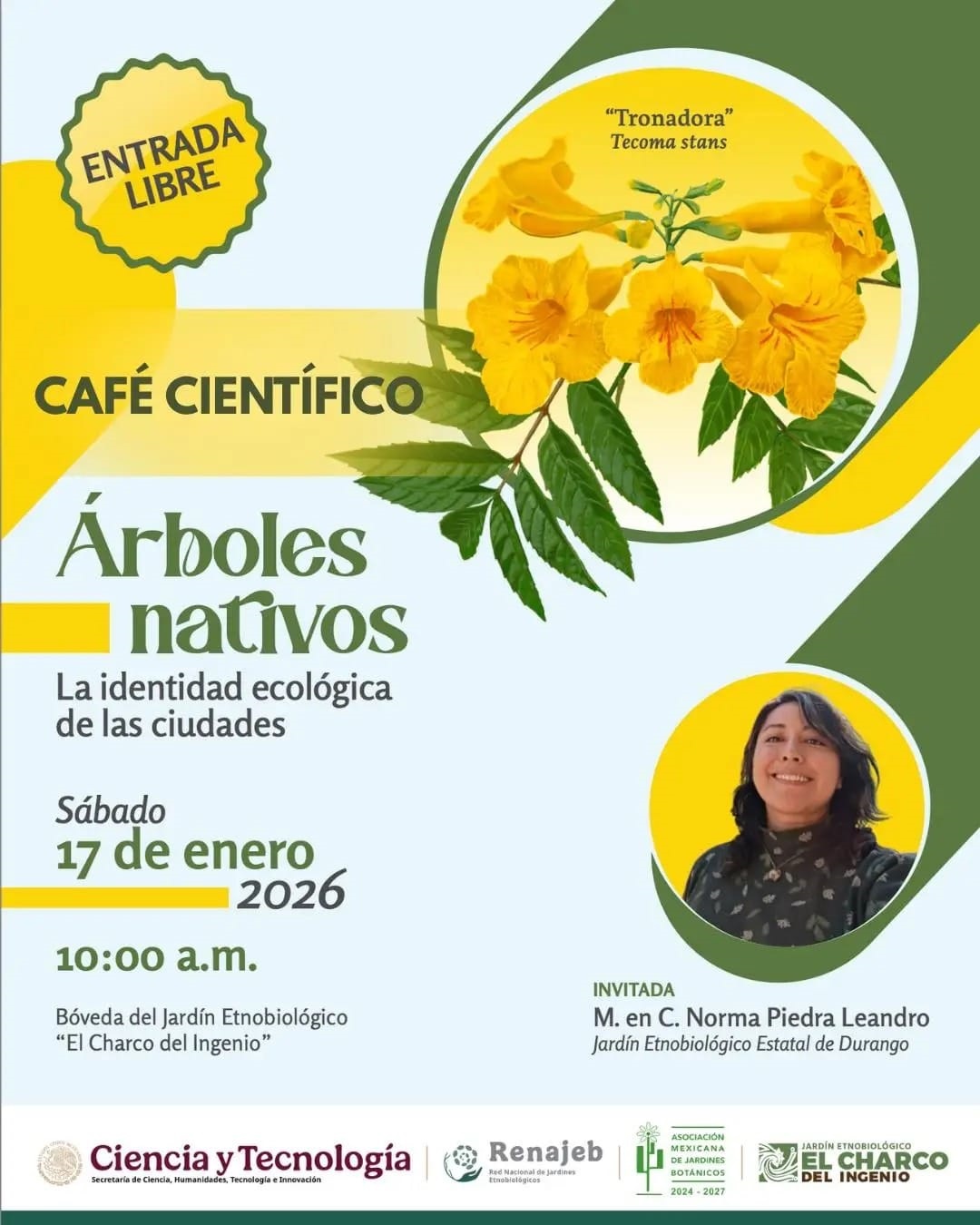 Café Científico sobre la importancia de los árboles nativos para la resiliencia y la sostenibilidad urbana. La invitada M. en C. Norma Piedra Leandro (Coordinadora de trabajo de campo del Jardín Etnobiológico Estatal de Durango; especialista en etnobiología, educación ambiental y botánica forestal) compartirá su experiencia de campo y explicará por qué elegir árboles nativos es clave para ciudades más resilientes y sostenibles. La entrada es libre. Se pide a las personas participantes llegar 10 minutos antes para registrarse el mismo día del evento. Organiza el Jardín Etnobiológico “El Charco del Ingenio”.