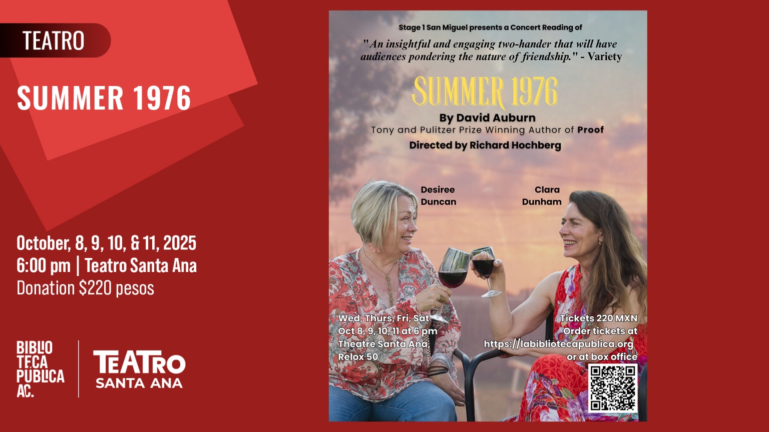 On October 8, 9, 10 and 11 (Wednesday through Saturday), at 6pm, Players Workshop will stage four performances of Summer, 1976 at the Santa Ana Theatre in the Biblioteca, Relox 50. The format is concert reading. Two of San Miguel's best actors, Clara Dunham and Desiree Duncan, have been cast as the unlikely friends. The director, Richard Hochberg, most recently directed Art, also at the Santa Ana.