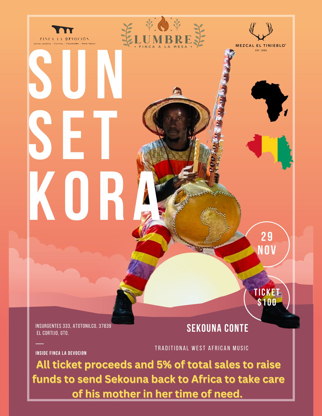 All ticket proceeds and 5% of sales help send Sekouna back to Africa to care for his mother.