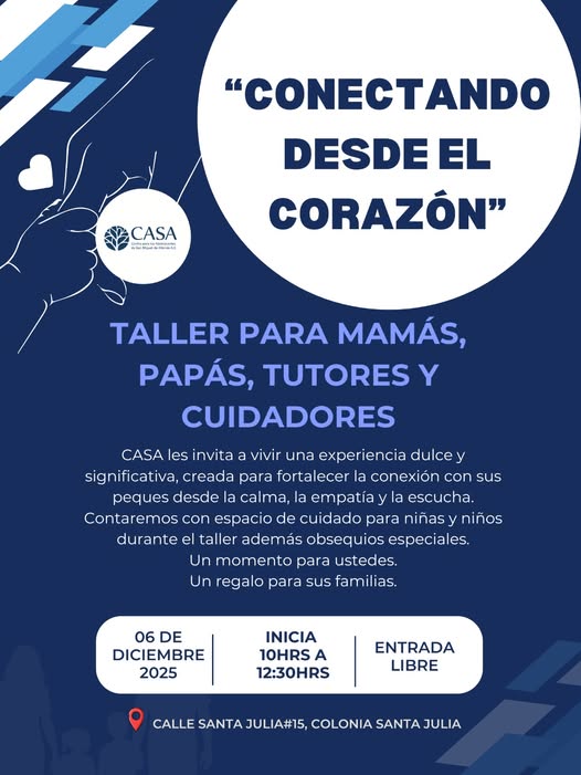CASA invita a vivir una experiencia dulce y significativa, creada para fortalecer la conexión con los pequeños desde la calma, la empatía y la escucha. Habrá espacio de cuidado para niñas y niños durante el taller, además de obsequios especiales. Un momento para ustedes. Un regalo para sus familias. Entrada libre.