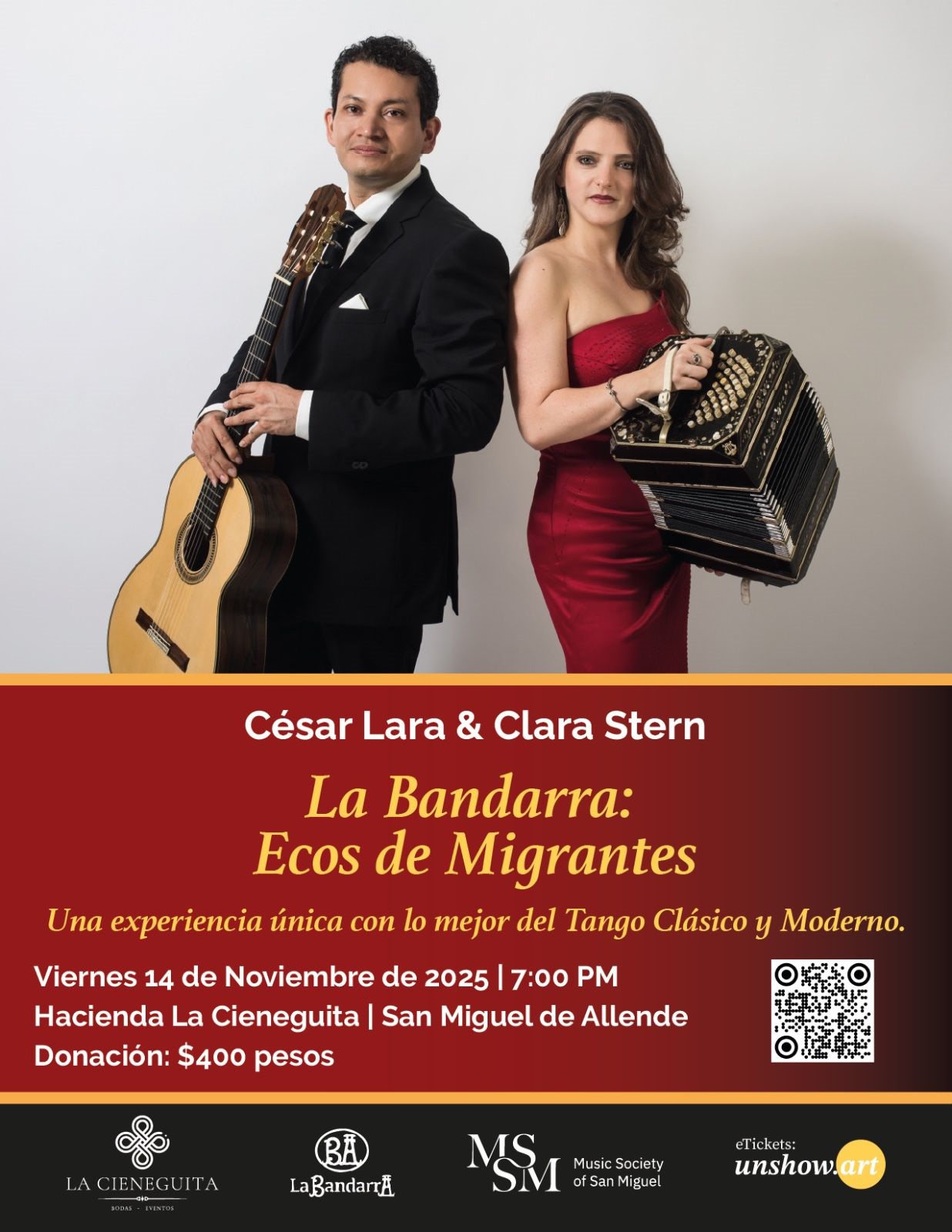 The duo La Bandarra, featuring Clara Stern on bandoneon and César Lara on guitar, presents Echoes of Migrants — a musical journey that bridges classical and contemporary tango while exploring identity, memory, and migration.