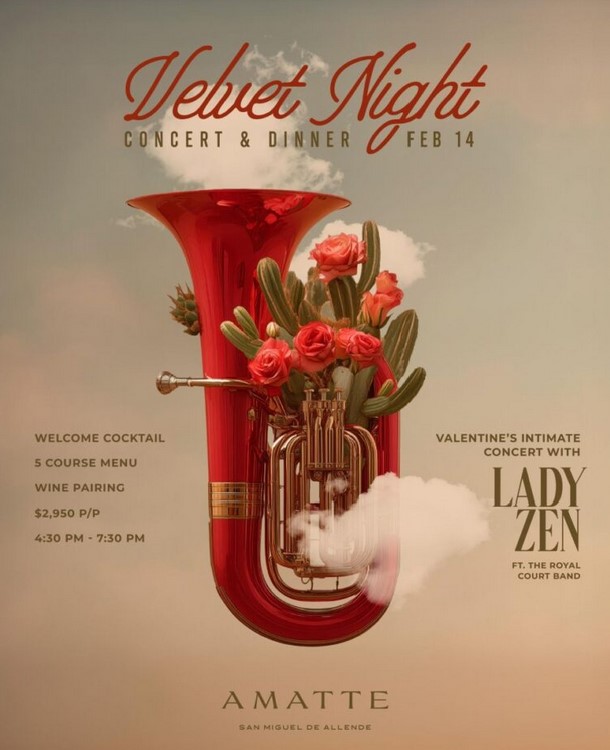 Valentine’s, Lady Zen -concert, dinner Saturday, February 14, 4:30pm & 7:30pm La Baha Restaurant Amatte Rooftop, 16A Calle Real Salida a Querétaro $2,950, reservation required, 415 140 0418