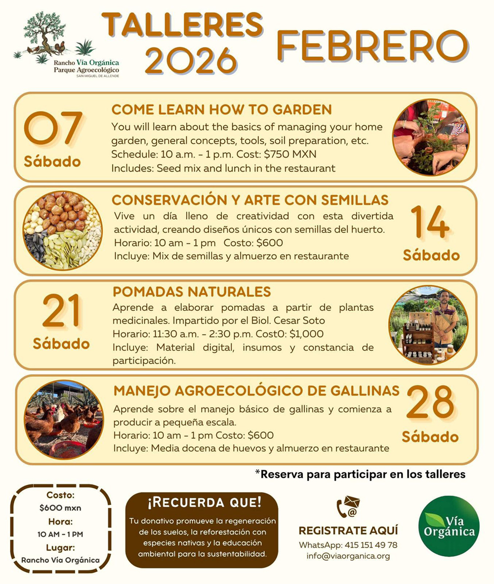 Ven a aprender a cultivar Aprenderás los conceptos básicos del manejo de tu huerto: conceptos generales, herramientas, preparación del suelo, etc. Horario: 10 a.m. – 1 p.m. Costo: $750 MXN Incluye: Mix de semillas y almuerzo en el restaurante