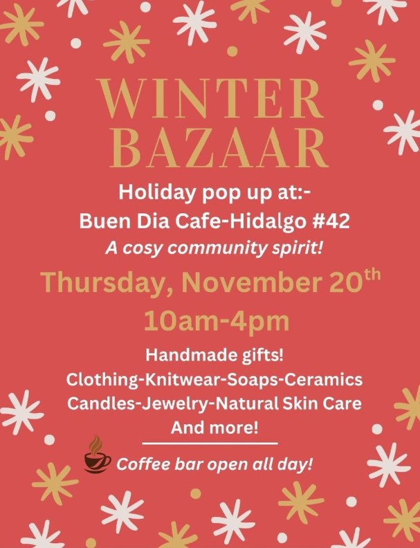 Un evento con un ambiente acogedor y comunitario donde podrás disfrutar comprando el regalo perfecto hecho a mano para el Día de Acción de Gracias o la Navidad. Habrá prendas tejidas, ropa, textiles, jabones, cerámica, joyería, velas, cuidado natural de la piel, bolsas de tela, arte en papel, galletas ¡y mucho más!
