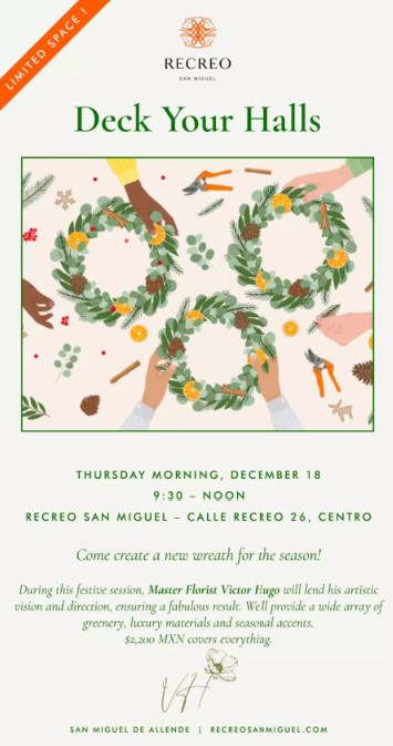 415 154 4820 hello@recreosanmiguel.com *** Deck Your Halls – taller Jueves 18 de diciembre, 9:30am–mediodía Recreo San Miguel, Calle Recreo 26 $2,200 pesos ¡Venga a crear una nueva corona para la temporada! Durante esta sesión festiva, el maestro florista Victor Hugo aportará su visión artística y dirección para asegurar un resultado fabuloso. Proporcionaremos una amplia variedad de follaje, materiales de lujo y acentos de temporada. $2,200 MXN cubren todo.