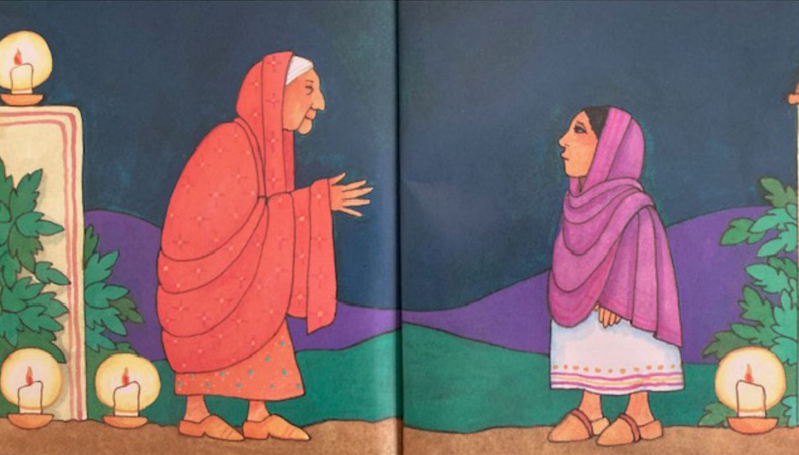 "Ah, Lucinda, cualquier regalo es hermoso porque se da. Todo lo que ofrezcas, el Niño Jesús lo amará, porque viene de ti". Lucinda mira a su alrededor y ve un grupo de altas hierbas verdes en un enredo cercano. Recoge un brazado y se vuelve para preguntarle a la anciana si ese humilde regalo será suficiente, pero la mujer ha desaparecido. (Algunos de los detalles de esta parte de la recreación de dePaola—especialmente la aparición de una mujer misteriosa que anuncia la curación milagrosa de un familiar—me parecen tomados de la historia de la Virgen de Guadalupe, donde la Virgen le dice a Juan Diego que su tío ha sido curado de una fiebre. Véase mi artículo "'El milagro de Tepayac' de John Steinbeck" en Lokkal, 14 de diciembre 2025).