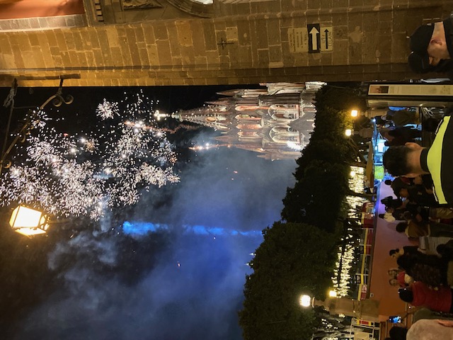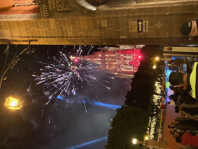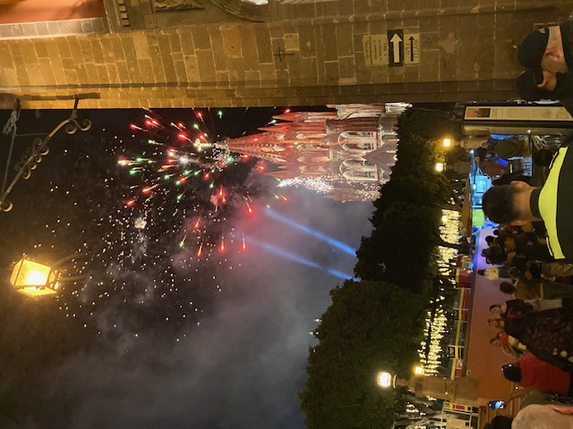 No estaba en absoluto preparado para lo que experimenté—las multitudes de fiesteros en el Jardín, la música festiva, las luces en los árboles, la mojiganga de Santa Claus, los cafés llenos, las heladerías y los vendedores de comida callejera con mucho trabajo. ¡Y luego los fuegos artificiales! Contra el telón de fondo de la Parroquia, los deslumbrantes estallidos de color y sonido me transportaron a mi infancia, cuando solo en el Cuatro de Julio podíamos disfrutar de espectáculos similares de pirotecnia mágica.