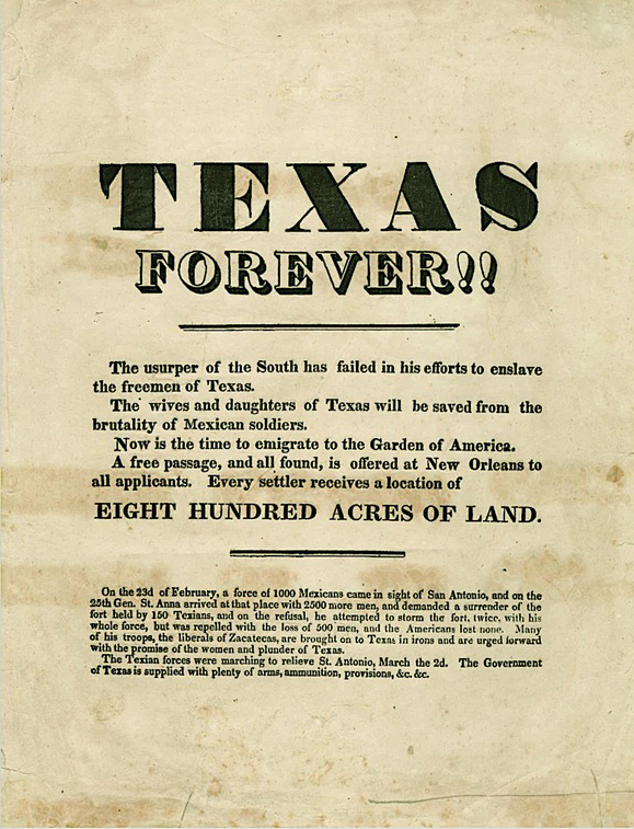 La otra interpretación pertenece a la escuela revisionista, que enseña que la revuelta de Texas, ejemplificada por la batalla del Álamo, se trató de colonos angloamericanos —principalmente cultivadores de algodón— empeñados en introducir la esclavitud en el nuevo país de México, libre de esclavitud. Habiendo sido invitados al territorio mexicano como agricultores, los colonos estadounidenses, ansiosos por maximizar sus ganancias, no iban a acatar las leyes mexicanas.