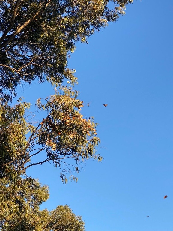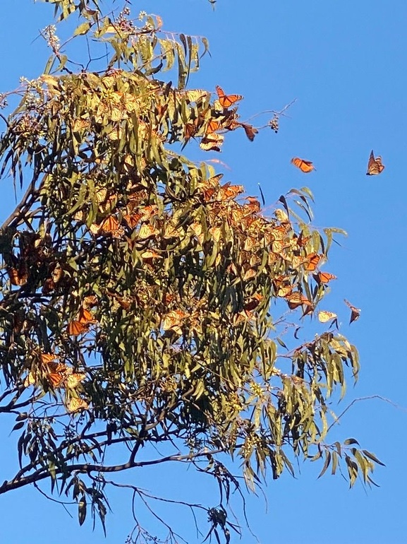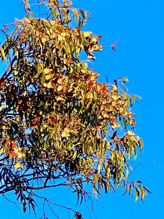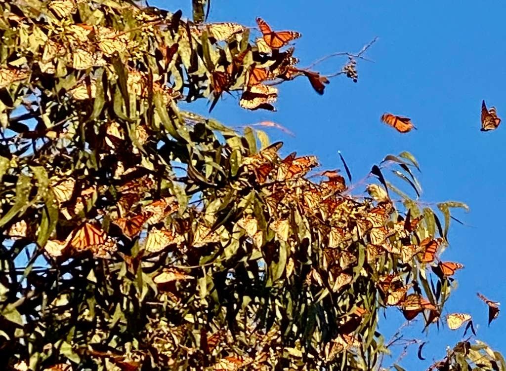 La semana pasada, en la entrada de Rancho Vía Orgánica en el camino a El Tigre, un caminante al atardecer se detuvo sobrecogido ante uno de los espectáculos más conmovedores de la naturaleza — un remolino de miles de mariposas Monarca descansando sobre un altísimo árbol de eucalipto. Sus delicadas alas anaranjadas brillaban en la luz agonizante mientras se preparaban para continuar su antiguo peregrinaje hacia el sur, rumbo a los santuarios invernales de Michoacán.