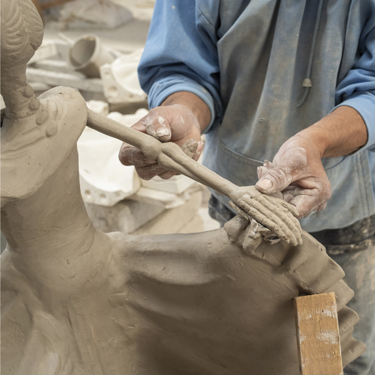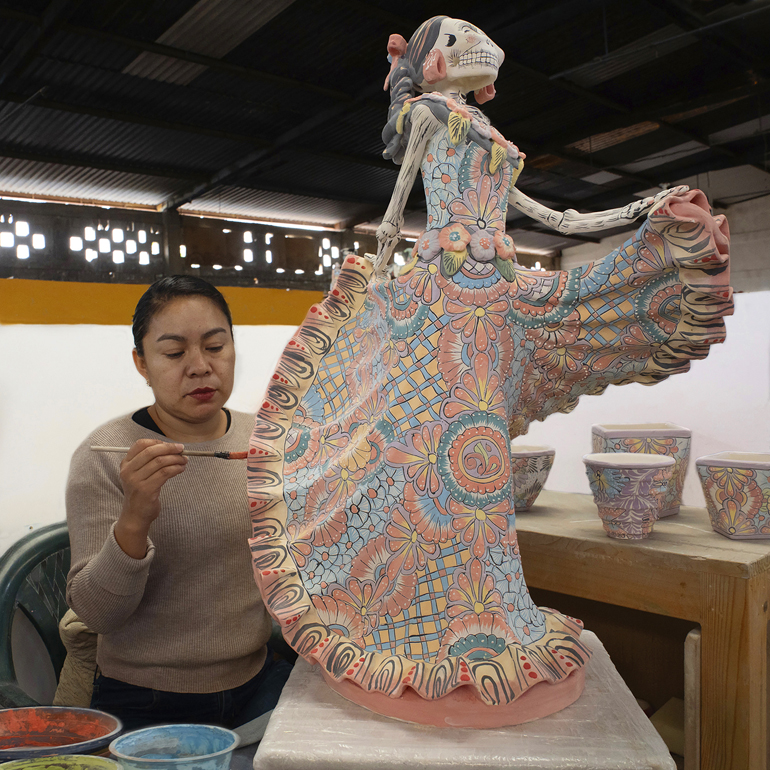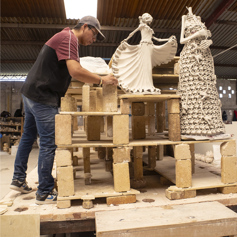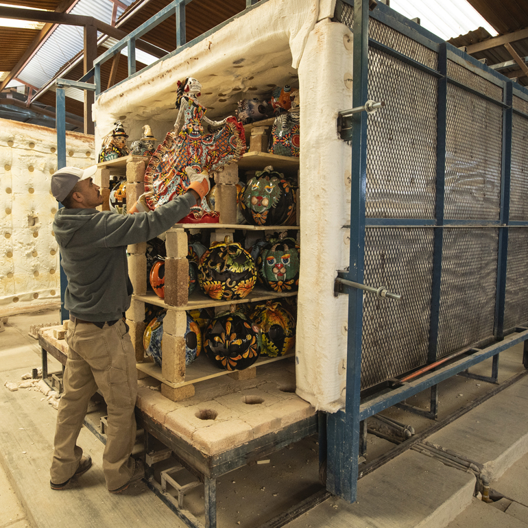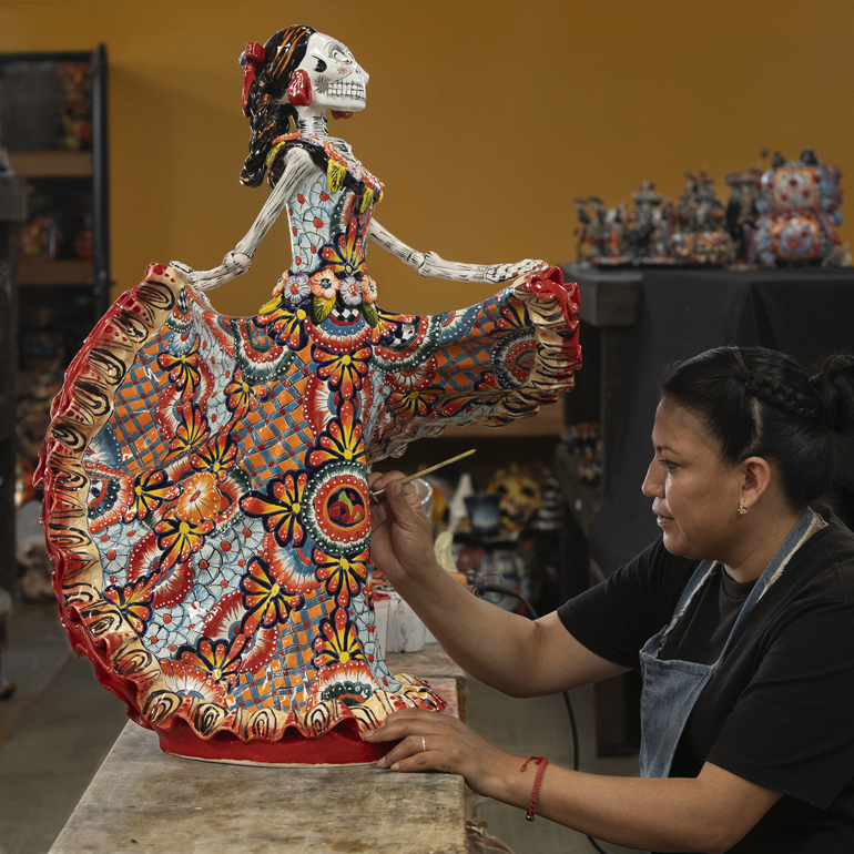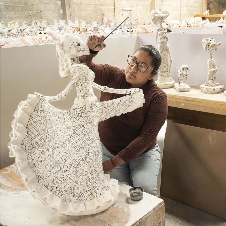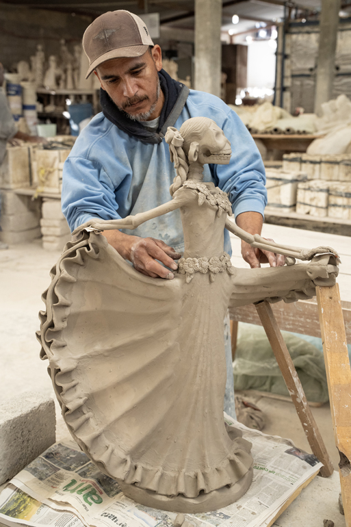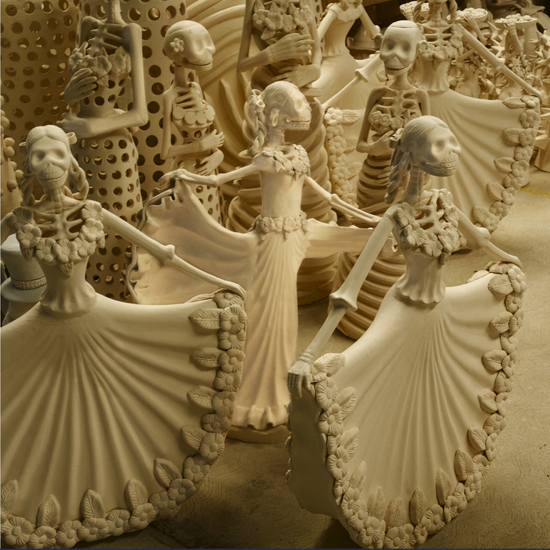 Al principio de este proceso, noté la creación de una impresionante catrina danzante de tamaño mediano, destinada a un cliente en Estados Unidos. Mientras observaba hacia atrás y luego hacia adelante en el proceso de elaboración de esta pieza, vi cómo esta catrina cobraba vida: primero a partir de una mezcla de barro líquido vertida en diez moldes de yeso diferentes, luego ensamblada en piezas, cocida inicialmente en un enorme horno a 1,015 grados Celcius, pintada con colores pastel iniciales y cocida una segunda vez en un horno a 1,050 grados para resaltar y fijar los nuevos colores brillantes. Un pequeño retoque para disimular las imperfecciones del proceso, y la catrina bailará para siempre.